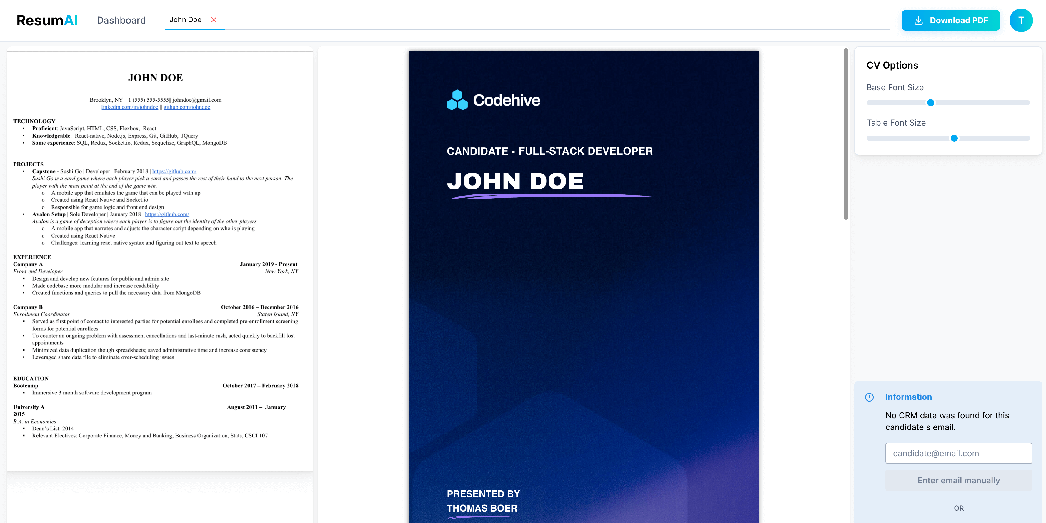 In de werving- en selectiebranche kost het vaak uren om van een aangeleverd CV een professioneel en consistent kandidaatprofiel te maken dat klaar is om aan de opdrachtgever te presenteren. Recruiters moeten informatie uit het CV handmatig samenvatten, opmaken in de huisstijl en controleren, wat zorgt voor tijdsdruk, hogere kosten en inconsistenties tussen profielen.